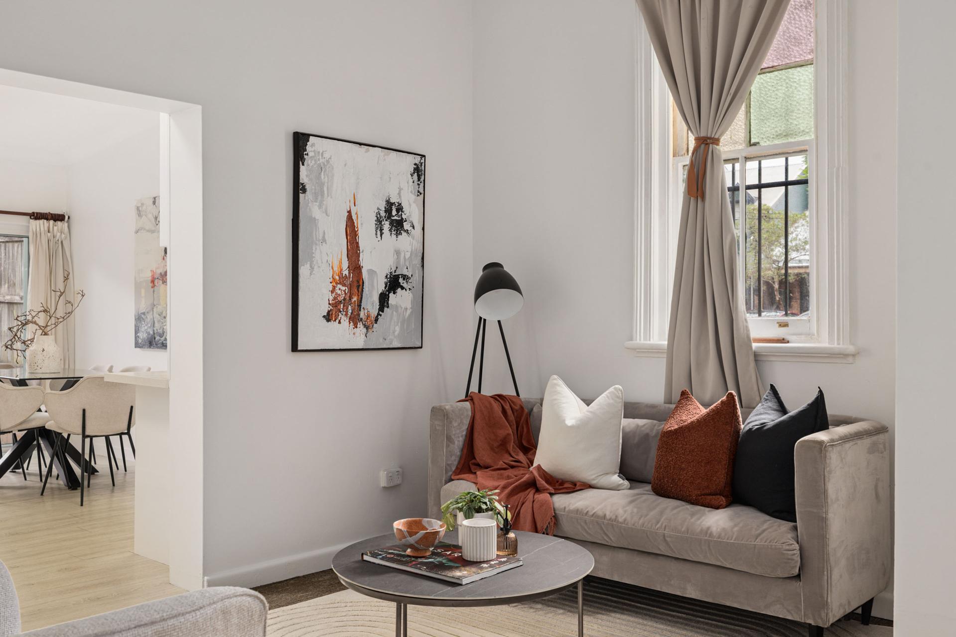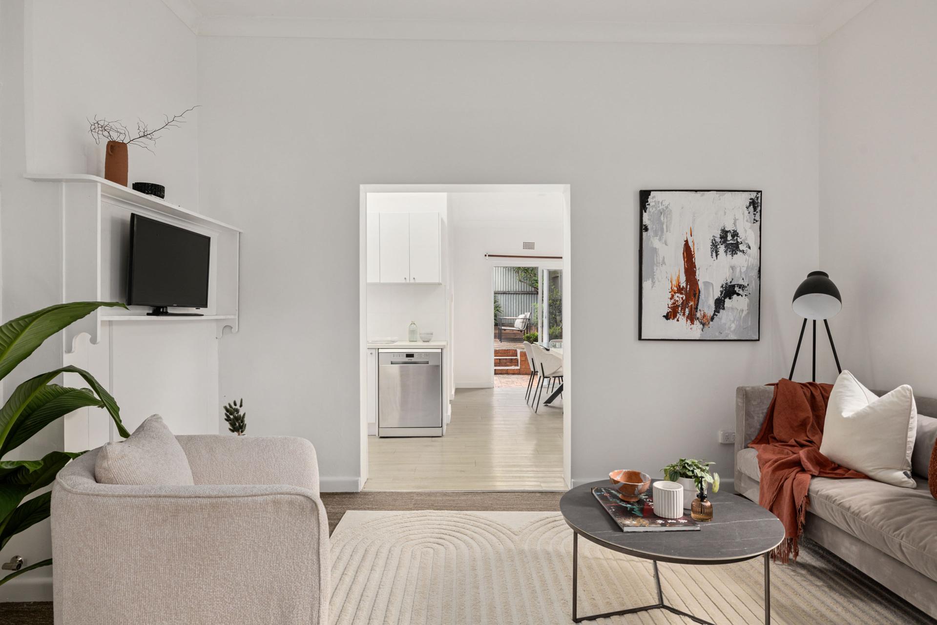 With frontages on both Kingston Road and leafy Trade Street, this corner cottage has characterful street presence and feeling of privacy from within. Neat and modern throughout an easy single level, it opens to a paved courtyard setting with potential to open up the floorplan, extend and possibly create access and parking via Kingston Lane (subject to approval). Stroll to Newtown or Stanmore train stations, Emma’s Snack Bar, and both King Street and Enmore Road village hubs.